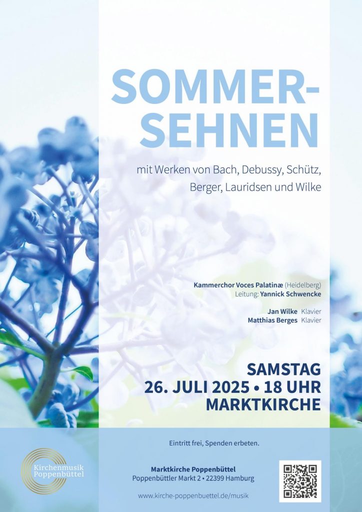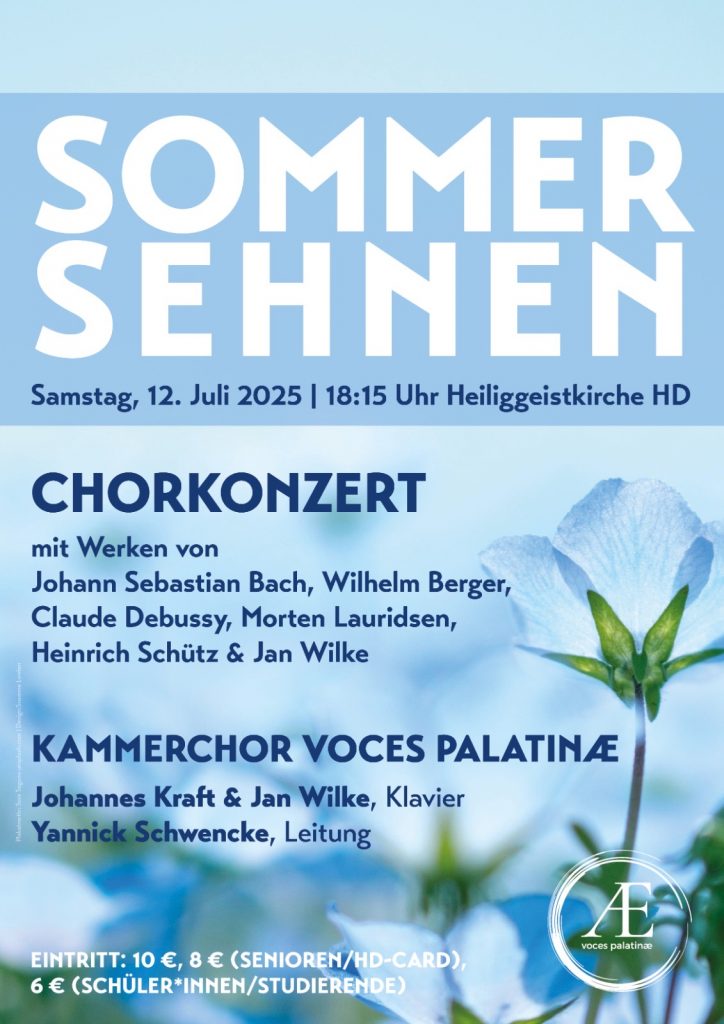 Unter dem Motto „Sommersehnen“ lädt der Kammerchor Voces Palatinæ zu einer musikalischen Sommerreise mit unterschiedlichen Klangfarben voll Licht und Lebenslust ein. Dabei erklingt Wilhelm Bergers märchenhafter Nixenreigen, in dem in einer lauen Sommernacht eine Schlossruine zum Klang von Harfen und holden Stimmen durch Fabelwesen kurz zu neuem Leben erweckt wird.